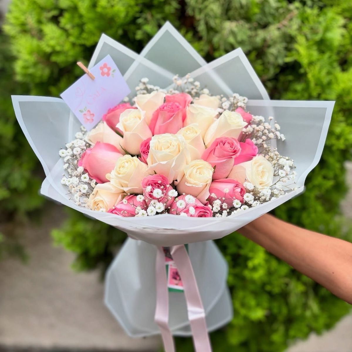 25 rosas blancas y rosa delicado ✨
