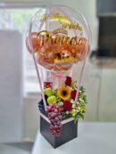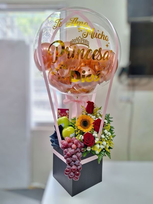 Detalle de frutas con peque帽o arreglo floral y globo burbuja